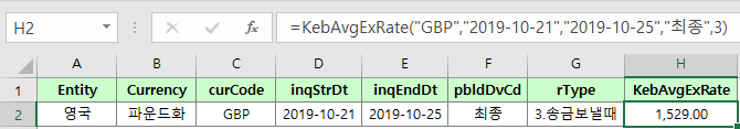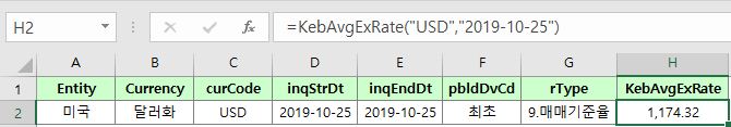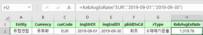 - =KebAvgExRate(curCode,inqStrDt,[inqEndDt],[pbldDvCd],[rType])