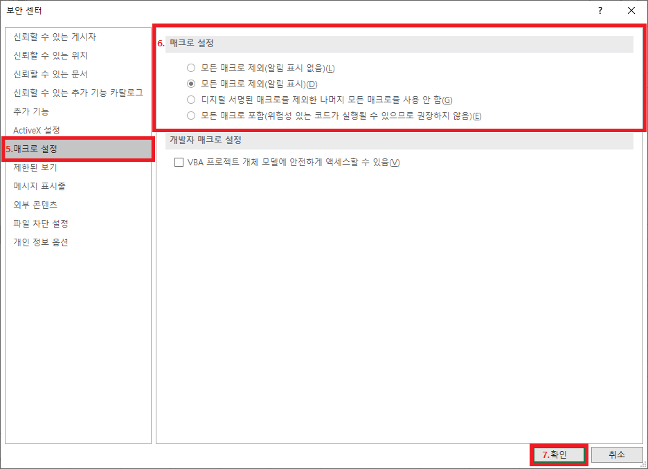 문서에 포함된 모든 매크로와 매크로에 대한 보안 경고가 사용되지 않습니다.