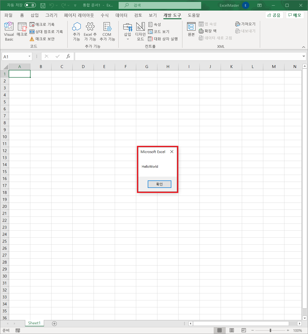 HelloWorld가 적힌 메시지 박스가 보이는 것을 확인하실 수 있습니다.