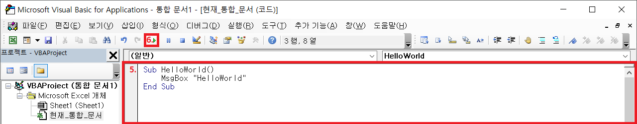 코드 창에 다음과 같이 입력하고, 표준 도구 모음에서 Sub/사용자 정의 폼 실행을 선택하거나 F5를 누르세요.