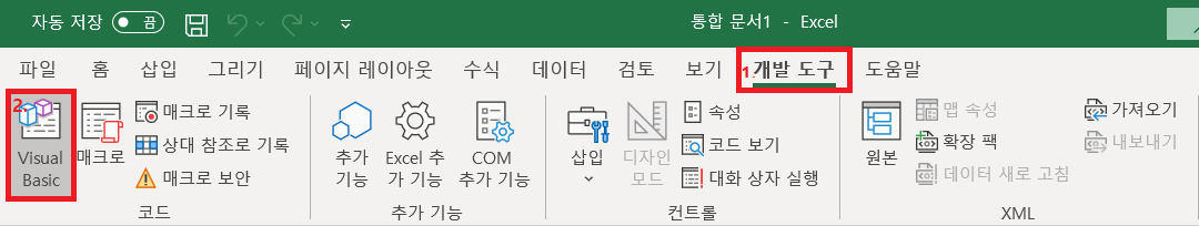 개발 도구 탭에서 Visual Basic을 선택하거나 ALT+F11를 누르세요.