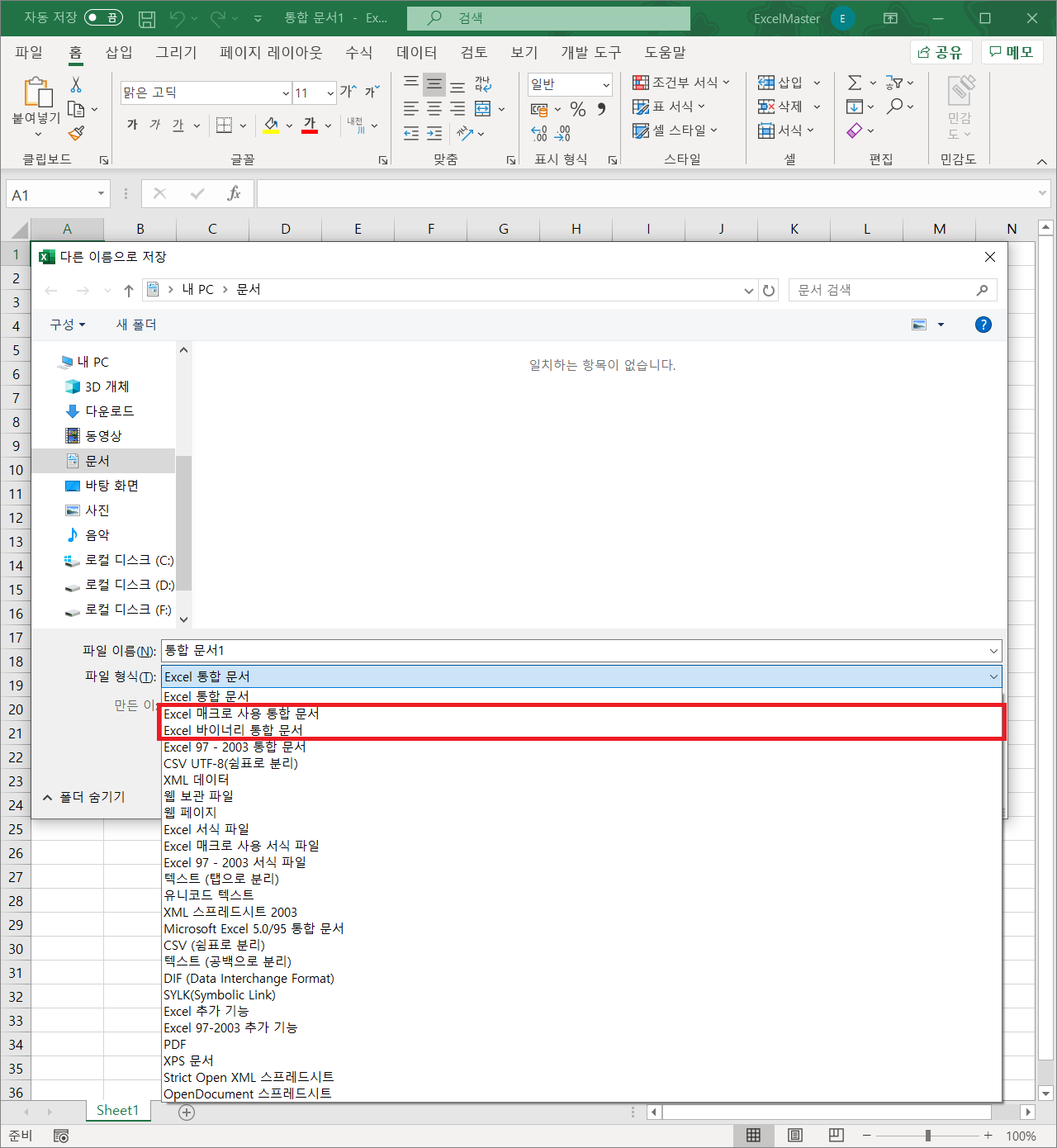 VBA를 작성한 파일을 저장하실때 파일 형식은 아래의 형식 중에서 하나를 선택하세요.