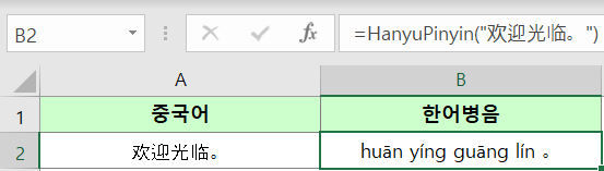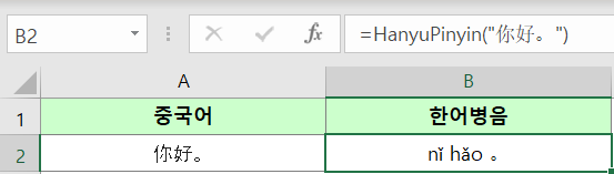 - HanyuPinyin 함수는 엑셀에서 기본으로 제공하는 함수가 아닌 사용자 정의 함수로서 추가기능 파일을 다운받고 엑셀에서 추가기능 활성화 후 사용하시기 바랍니다.