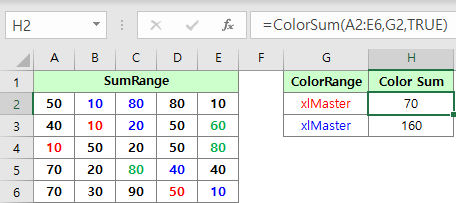 Function ColorSum(sumRange As range, colorRange As range, Optional colorType As Boolean = False) As Double